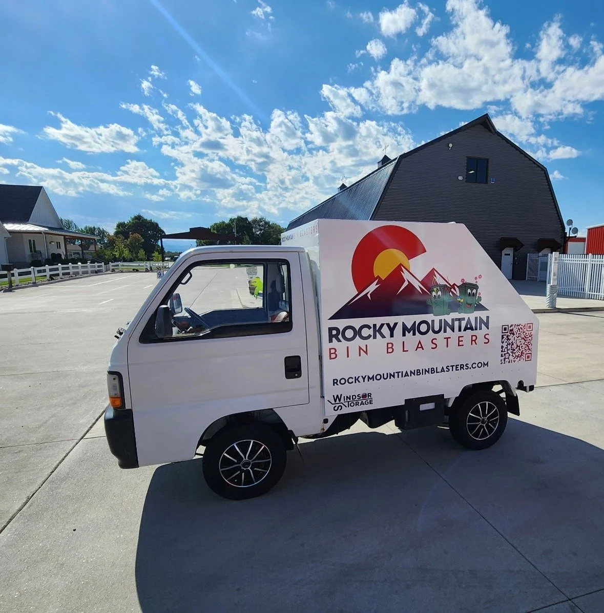 Small white utility vehicle with advertising for Rocky Mountain Bin Blasters, parked outdoors on a concrete lot under a partly cloudy sky.